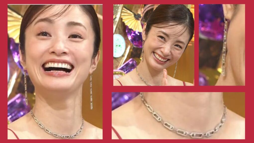 上戸彩さんが2025年M-1の司会で身につけているのは、キラキラしたネックレスとピアスです。