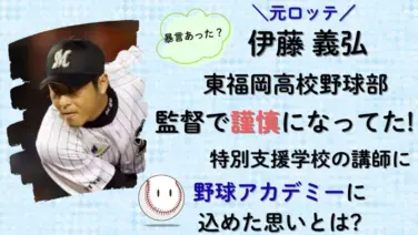 プロ・メジャー 伊藤義弘は東福岡高校野球部の監督で謹慎に!不適切発言の内容は? 元ロッテ投手・伊藤義弘さんは東福岡高校野球部監督として就任後、不適切発言や暴言によって2度の謹慎。その後、特別支援学校の非常勤講師に。開講したアカデミーに込めた思いとは?再出発の道をたどります。 2025.10.10 プロ・メジャー