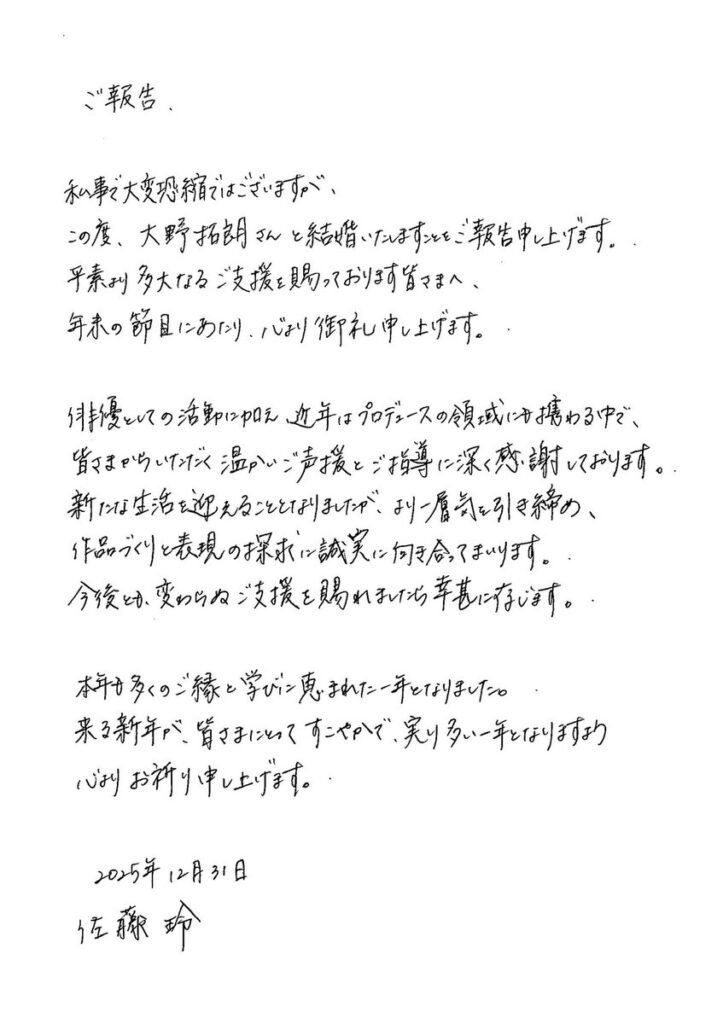佐藤玲さんが自身のXで、結婚報告をした直筆の文章がこちらです。